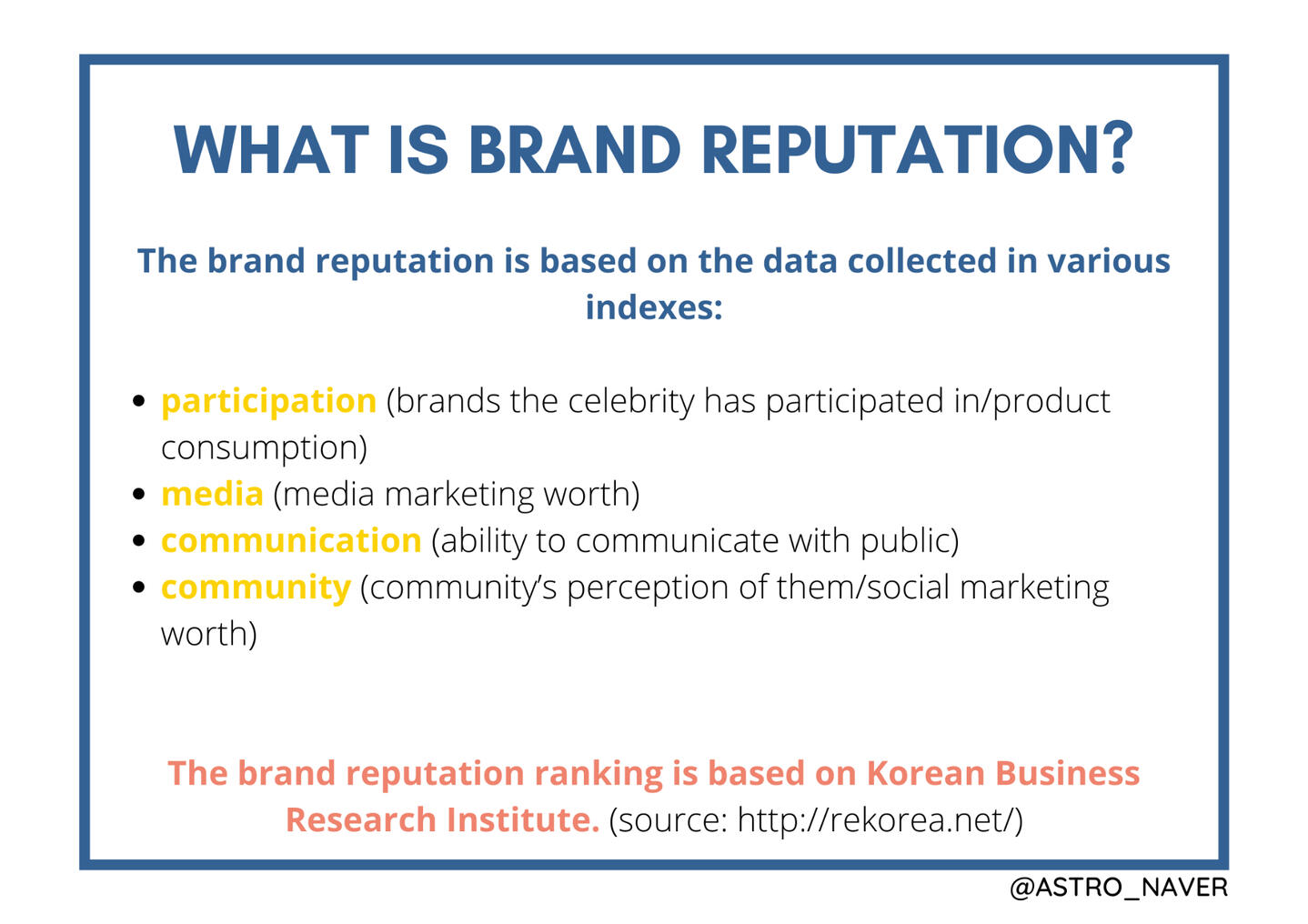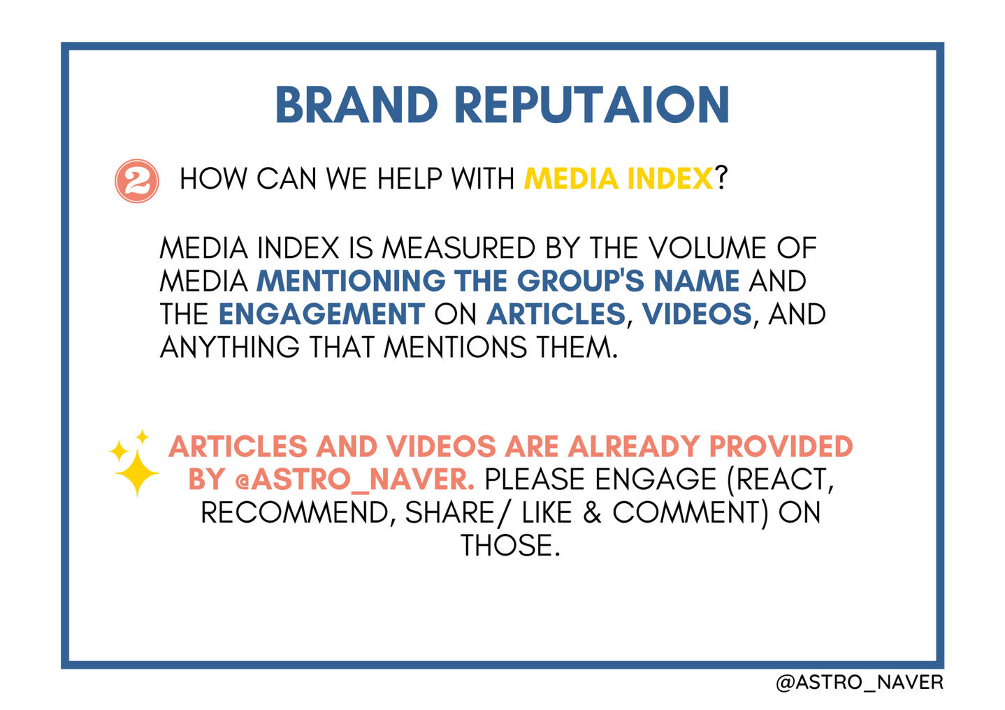 BRAND REPUTATION helps give ASTRO potential schedules before, after, and during their comeback. It is important to help them increase their group and individual brand reputation to let producers and businessmen know that they are in demand to the public.
